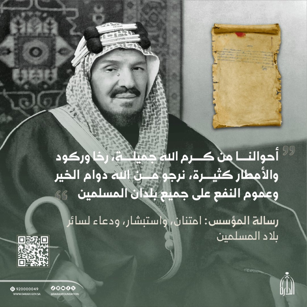 دارة الملك عبدالعزيز تبرز برقية للملك المؤسس تشيد بالرخاء والأمن