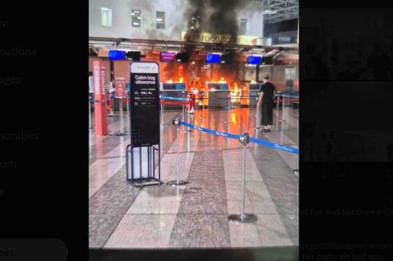 وقبل إشعال النيران، أثار الشاب الفوضى في منطقة تسجيل الوصول، حيث بدأ بسب موظفي المطار، ثم قام بتحطيم شاشات عرض الرحلات القادمة والمغادرة باستخدام مطرقة.