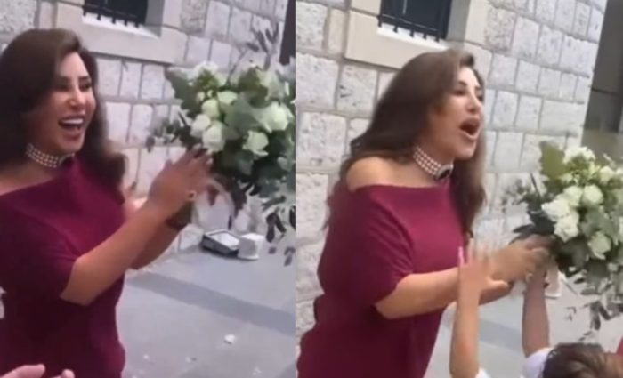 حيث يظهر في الفيديو لهفة الفنانة الشهيرة على مستوى الوطن العربي وهي تتسابق بلهفة كبيرة لالتقاط بوكيه الورد الذي ترميه العروسة.