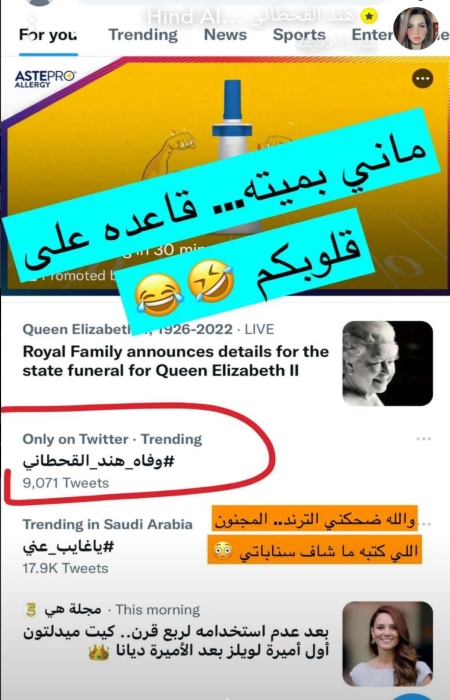 تصدر إسم هند القحطاني الترند على محركات البحث بعبارة “وفاة هند القحطاني”، ما جعل قسم كبير من المتابعين يصدق الخبر ويترحم عليها.