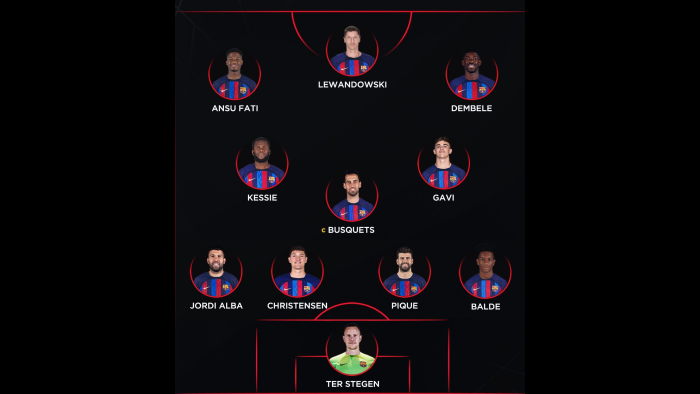 “تير شتيجن – بالدي – بيكيه – كريستينسن – ألبا – بوسكيتس – كيسي – جافي – فاتي – ديمبلي – ليفاندوفسكي”.