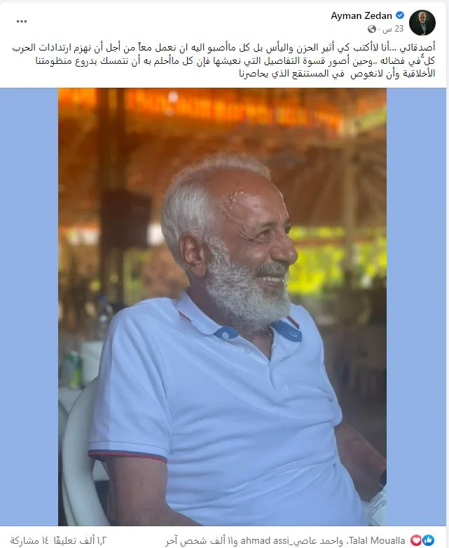 شارك الفنان السوري الشهير أيمن زيدان صورة جديدة له عبر حسابه بموقع التواصل الإجتماعي فيسبوك وعلق عليها: ” أصدقائي …أنا لاأكتب كي أثير الحزن واليأس بل كل ماأصبو اليه ان نعمل معاً من أجل أن نهزم ارتدادات الحرب كل ُّفي فضائه ..وحين أصور قسوة التفاصيل التي نعيشها فإن كل ماأحلم به أن نتمسك بدروع منظومتنا الأخلاقية وأن لانغوص في المستنقع الذي يحاصرنا”.
