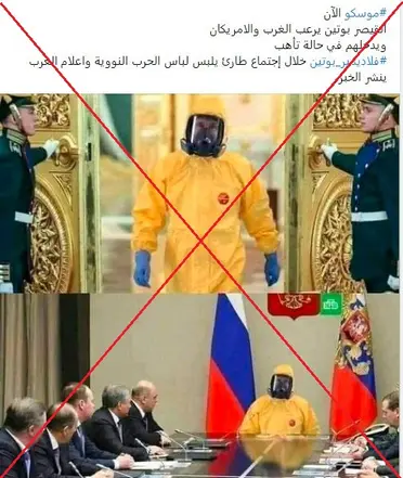 بدورها، ركبت الصورة الثانية من صورتين: الأولى من الزيارة نفسها لمرضى كوفيد في المستشفى بموسكو في مارس 2020، والثانية من اجتماع لمجلس الأمن الروسي عام 2020.