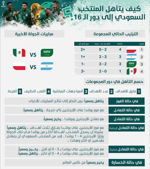 وإذا تعادل المنتخب السعودي إيجابيا مع المكسيك مع فوز الأرجنتين على بولندا بفارق 3 أهداف يتأهل رسمياً بشرط أن يسجل أهدافاً أكثر من بولندا في هذه الجولة فمثلا لو انتصرت الارجنتين 4-1، فلا بد أن يتعادل المنتخب السعودي بهدفين أو أكثر.