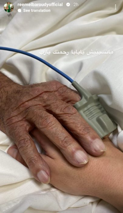 ونشرت عبر خاصية الـ”ستوري” عبر “انستغرام” في حسابها الشخصي صورة لها وهي تمسك بيديه من على فراش المرض، وعلقت عليها بطريقة مؤثرة: “ماتسبنيش يا بابا رحمتك يا رب”.