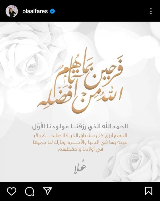 ونشرت علا الفارس عبر صفحتها الشخصية على إنستقرام، منشورًا جاء فيه الآية القرآنية “فرحين بما آتاهم الله من فضله” ومدعومًا بالكلمات التالية، “الحمدلله الذي رزقنا مولودنا الأول اللهم ارزق كل مشتاق الذرية الصالحة وقر عينه بها في الدنيا والآخرة، وبارك لما جميعا في أولادنا واحفظهم”.