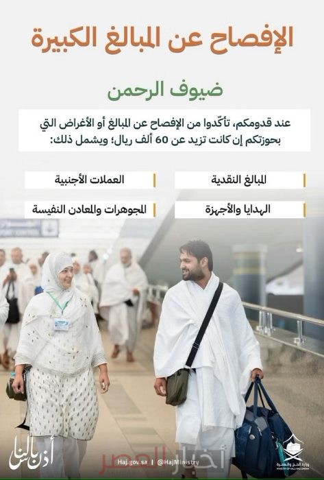 دعت وزارة الحج الحجاج القادمين إلى المملكة لأداء فريضة الحج هذا العام إلى الإفصاح عن المبالغ المالية والأغراض التي بحوزتهم قبل دخولهم، وذلك من أجل ضمان سهولة وسرعة إجراءات الدخول وتفادي أي مشكلات أمنية أو قانونية.