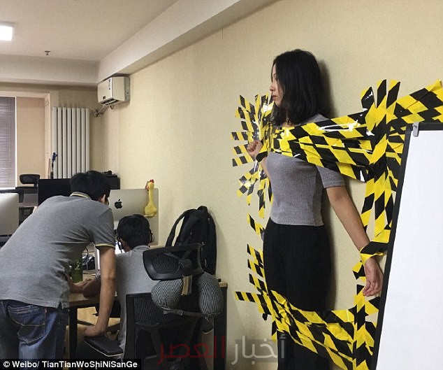 في الوقت الذي تم وضع المرأة فيه على الحائط، كان زميلان لها يقومان بأعمالهما بدون أي اهتمام بما يحدث. تم نشر الصور في حساب على “ويبو” في وقت ماضي، وقد تمت مشاركتها مع تعليق يقول: “انظروا إلى رفيقتي الجميلة في العمل، عثر عليها المدير وهي تقود السيارة دون ارتداء الحزام”.