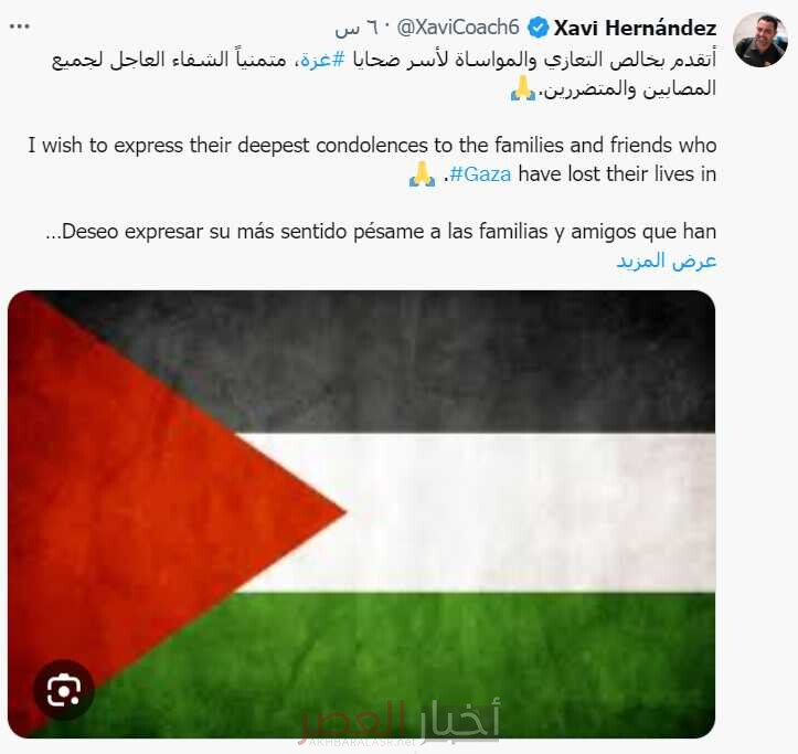 انتشر على مواقع التواصل الاجتماعي منشور تضامني على صفحة موثقة في تويتر تحمل اسم المدرب تشافي هيرنانديز، مدرب فريق برشلونة، يعبّر عن تأييده وتعاطفه مع سكان مدينة غزة الذين يتعرضون لقصف عنيف من قبل الاحتلال الإسرائيلي.