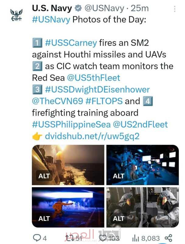 الجواب جاء من البحرية الامريكية حيث نشرت صفحة القوات البحرية الامريكية الرسمية على تويتر خبراً قالت فيه انها تصدت لمسيرات وصورايخ اطلقها الحوثي, وارفقت مع الخبر صورة للحظة اطلاق الصواريخ للتصدي للصواريخ القادمة من الحوثي.