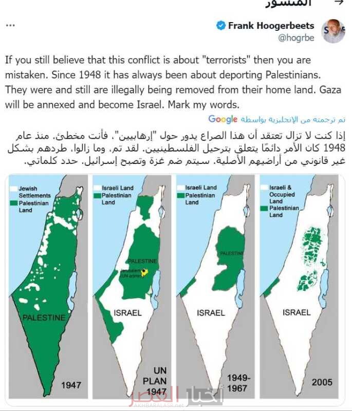 وقام بنشر صور تتضمن خرائط متعددة تكشف عن تآكل الأراضي الفلسطينية نتيجة للغزو الاسرائيلي.