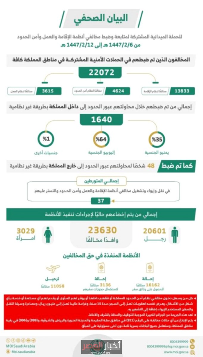 ولم تقتصر الجهود على ضبط المخالفين، بل طالت المتورطين في تسهيل هذه المخالفات، حيث تم القبض على 37 شخصًا بتهمة نقل وإيواء وتشغيل المخالفين والتستر عليهم