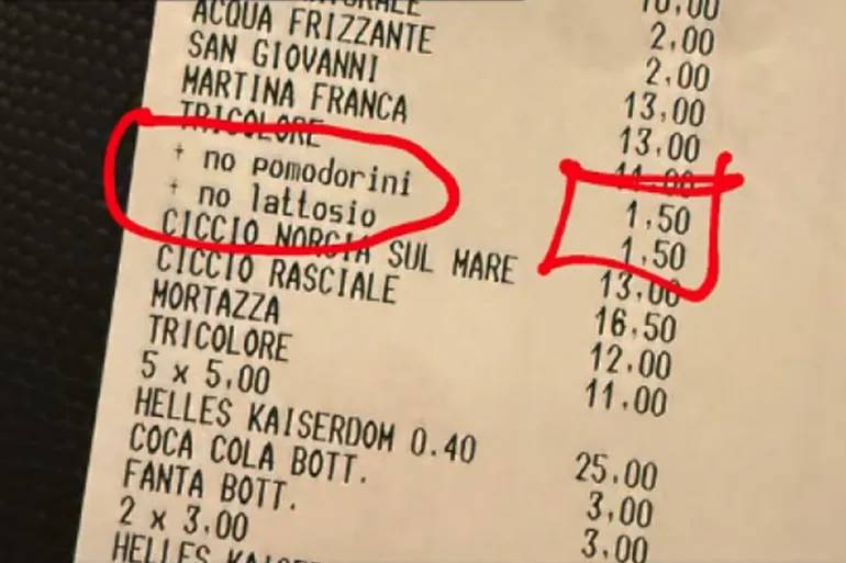 وذكرت دي ليدو أنها فوجئت بإضافة 1.50 يورو لحذف الطماطم من البيتزا، و1.50 يورو أخرى لطلبها أن تكون خالية من اللاكتوز، ليرتفع سعر البيتزا من 14 إلى 17 يورو.