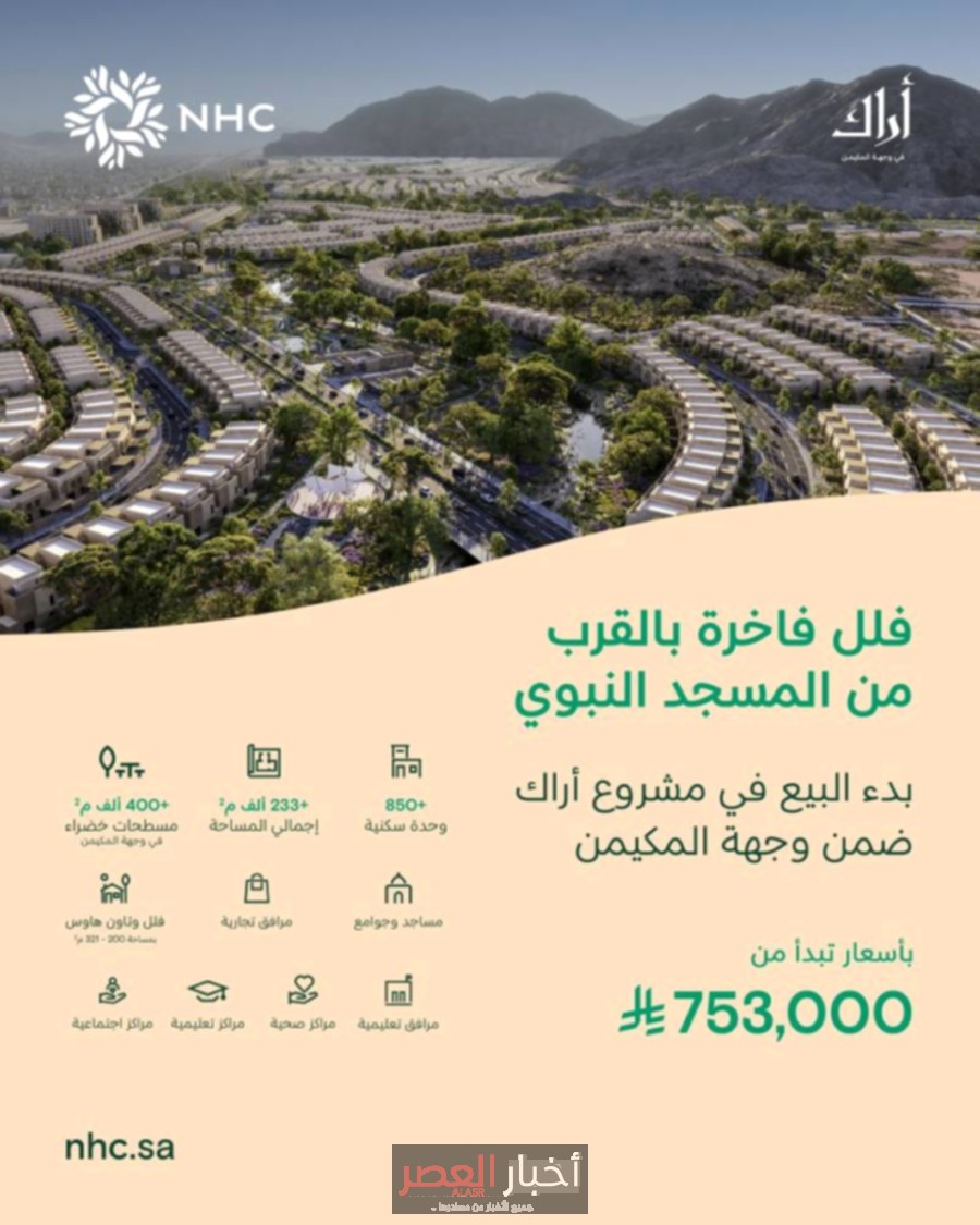 أعلنت الشركة الوطنية للإسكان (NHC) عن إطلاق البيع في مشروعها الجديد “أراك المكيمن” بالمدينة المنورة، والذي يقع ضمن وجهة المكيمن، مقدّمًا فرصًا للتملك في وحدات سكنية عصرية. يتميز المشروع بموقعه الاستراتيجي بالقرب من المسجد النبوي الشريف وجامعة طيبة، بالإضافة إلى قربه من المرافق الحيوية.